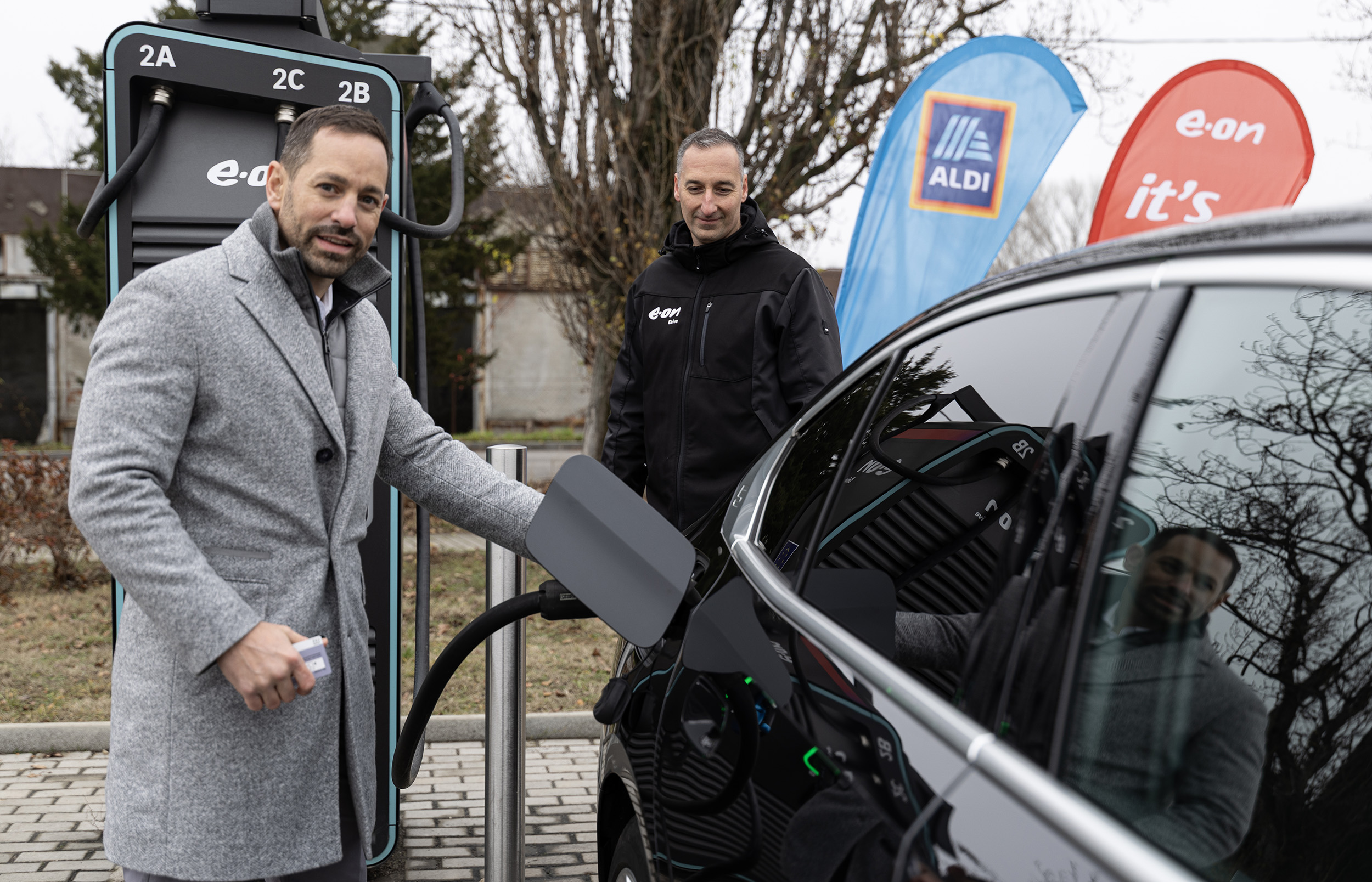 Képaláírás: Boros Péter, az E.ON Drive Infrastructure Hungary ügyvezető igazgatója és Bernhard Haider, az ALDI Magyarország Élelmiszer Bt. országos ügyvezető igazgatója átadják az Érd, Sulák utca 2. szám alatti ALDI áruház újabb e-töltőjét