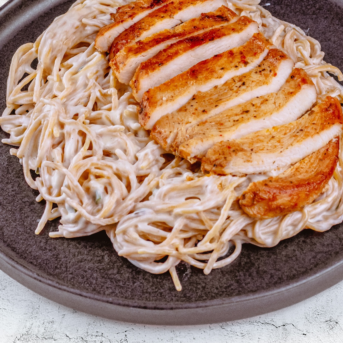 - A tésztát pár percig a serpenyőben hagyjuk, majd tányérra szedjük és csíkozott csirkemellszeletekkel tálaljuk.
