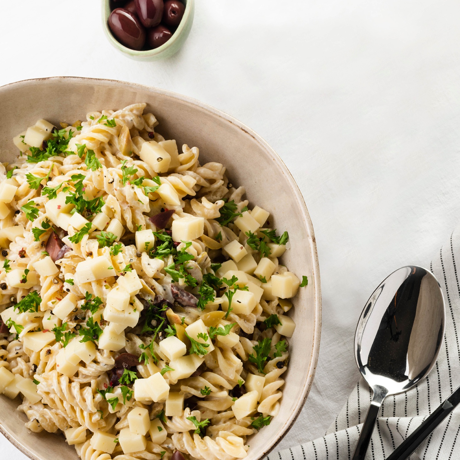 - Az olívabogyókat és a sajtot apró darabokra vágjuk.