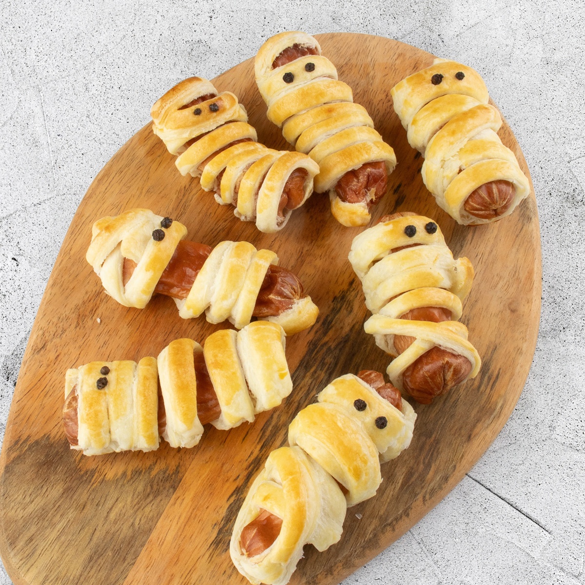 - Amikor minden virslimúmia elkészült, a felvert tojással megkenjük őket és 2-2 egész borsból szemeket nyomunk rájuk.